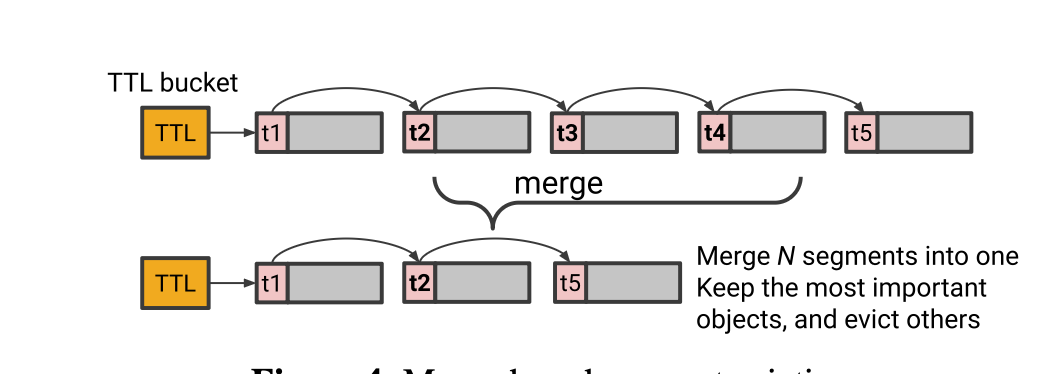 SegCache uses a merge-based eviction algorithm. The basic idea is to merge some segments into one and only keep a relatively small portion of the objects that are more likely to be accessed in the future.