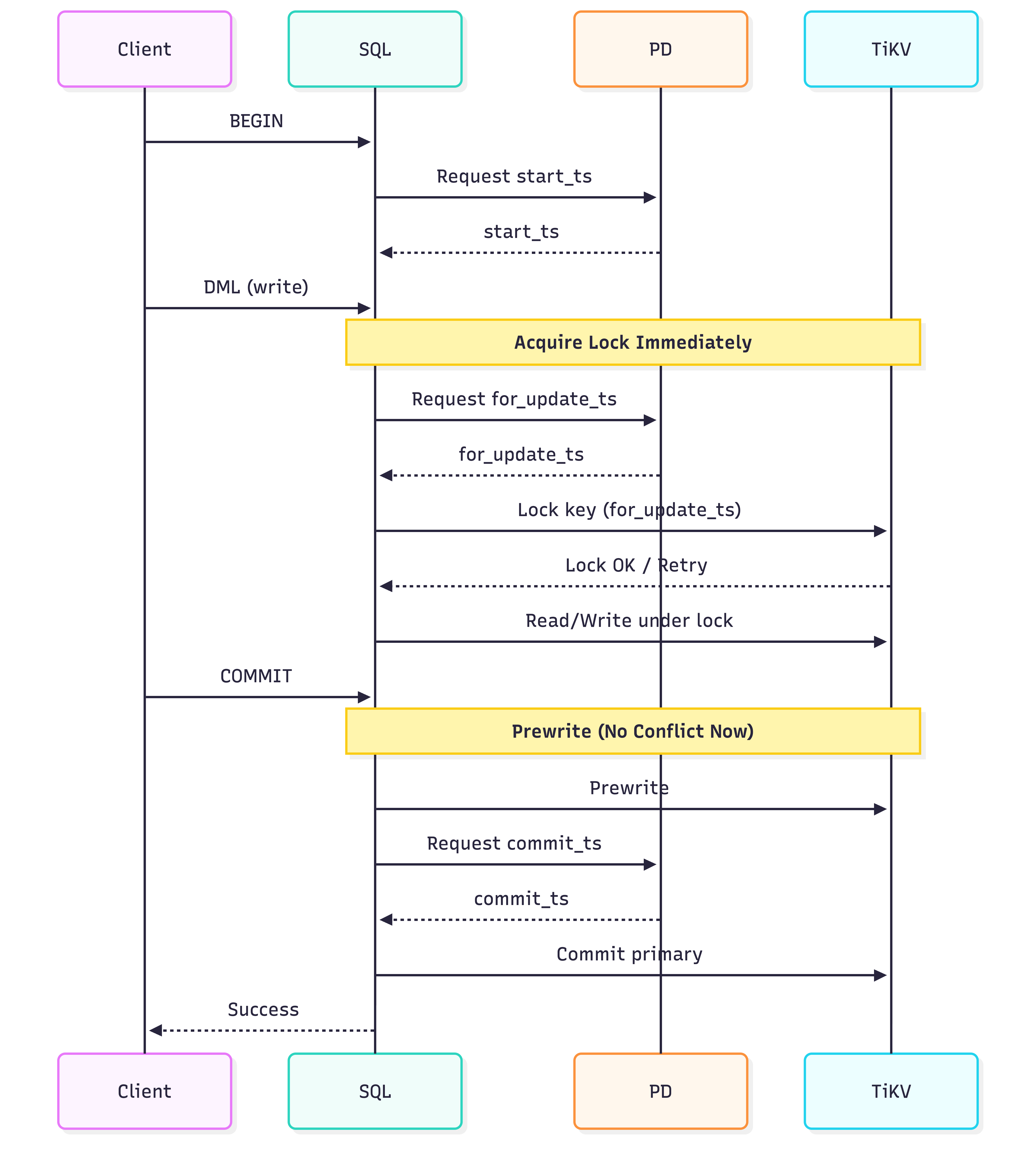 In pessimistic transactions, locks are acquired immediately when DML statements are executed, before the prewrite phase. Each lock acquisition uses a new timestamp called for_update_ts. If a lock cannot be acquired, the transaction can retry from that specific operation instead of restarting entirely. Because conflicts are resolved early, once prewrite begins, the transaction is unlikely to fail due to write conflicts.