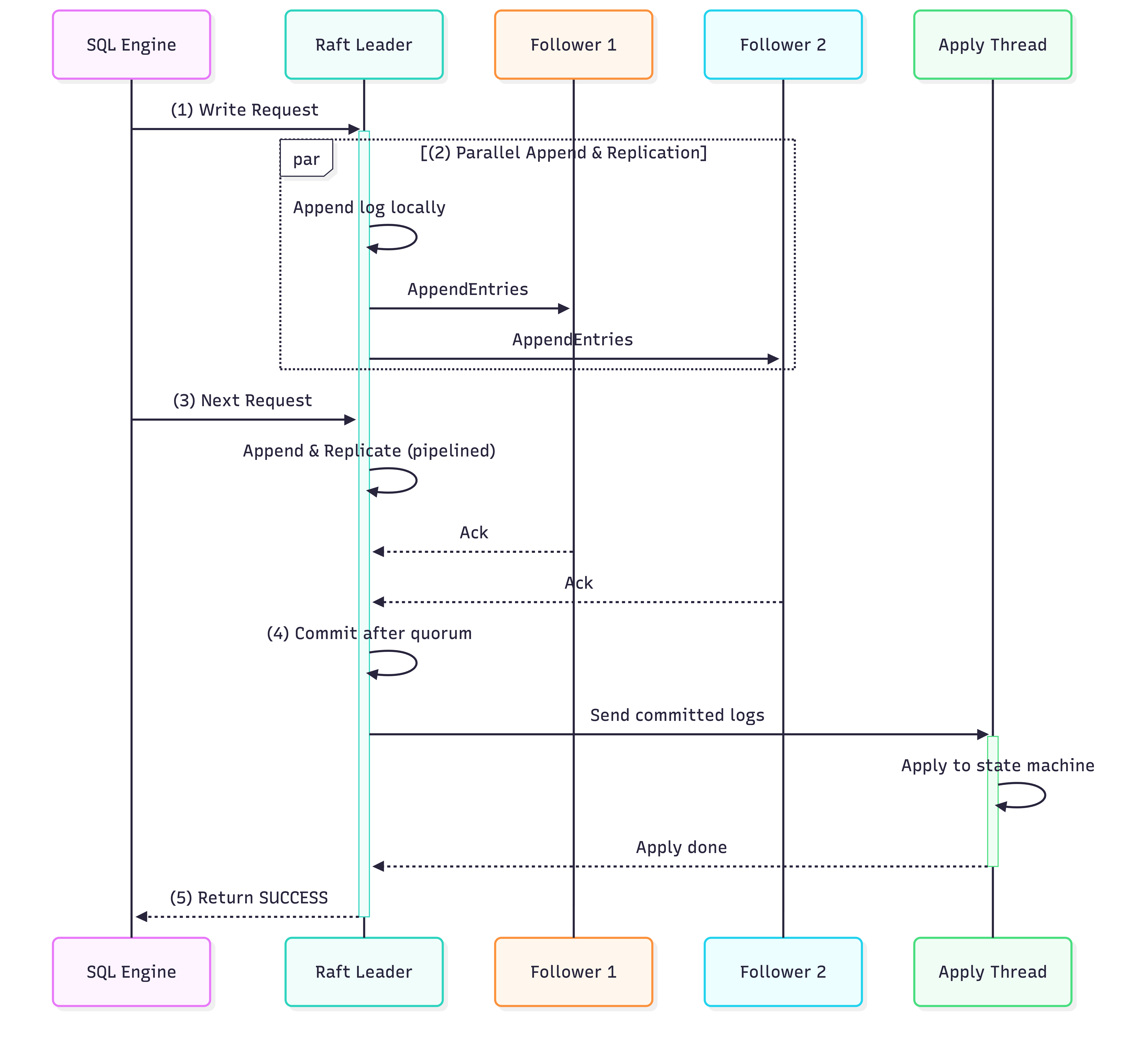 Data is synchronized between the two stores through Raft-based transactional log replication. In a traditional Raft group, multiple replicas maintain a replicated log. One node acts as the leader, and the others are followers. The leader handles writes and replicates log entries to followers. A write is considered committed once a quorum of replicas acknowledges it. This ensures strong consistency and high availability: if the leader fails, a follower can be elected as the new leader.