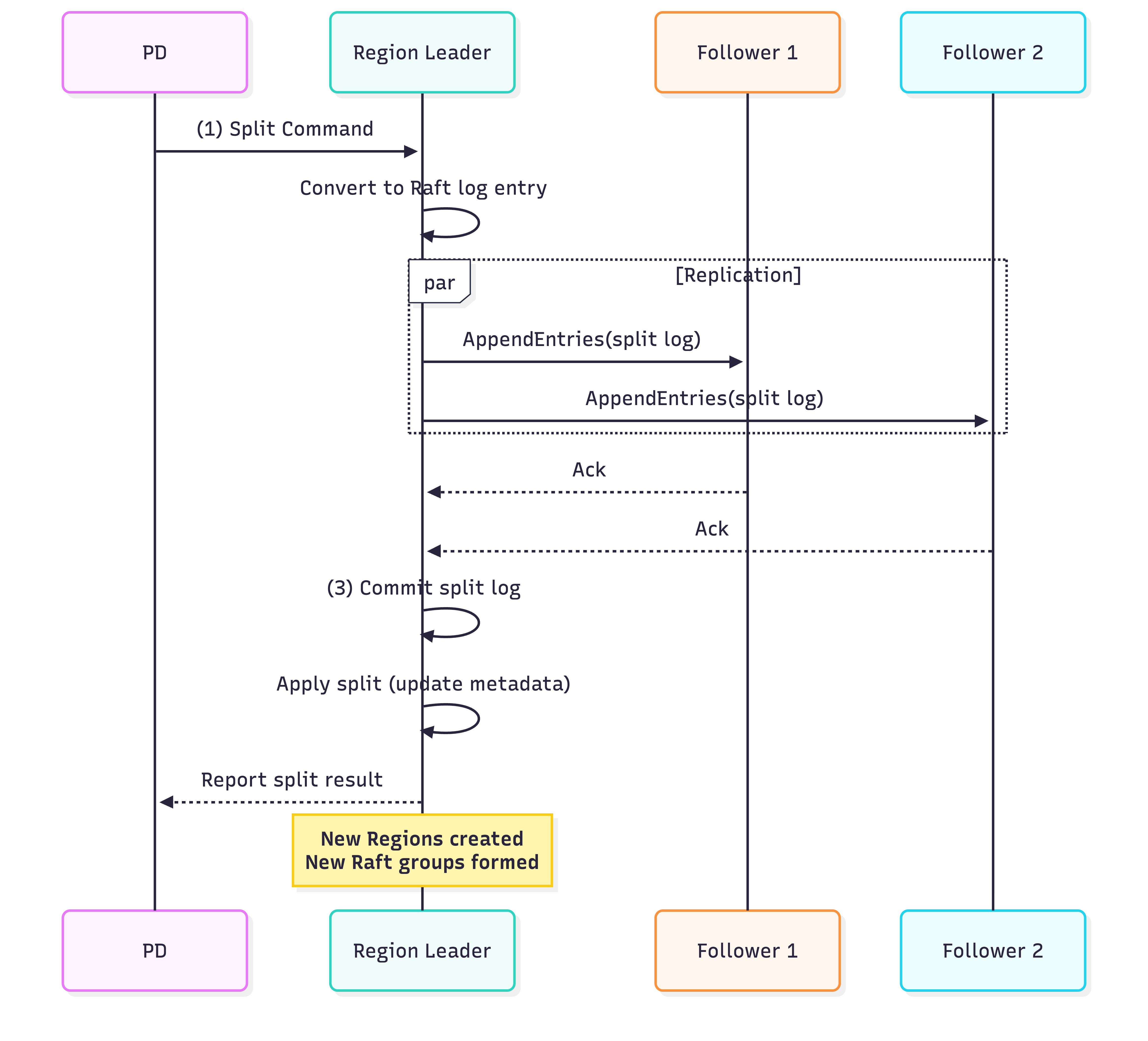 - Prepare merge and Commit merge logs: Region merging is not an immediate local operation. The source region writes a prepare‑merge log and sends a snapshot of its state to the target region. The target writes a commit‑merge log that references the source’s state. Only after both logs are committed across their respective Raft groups can the merge complete .
