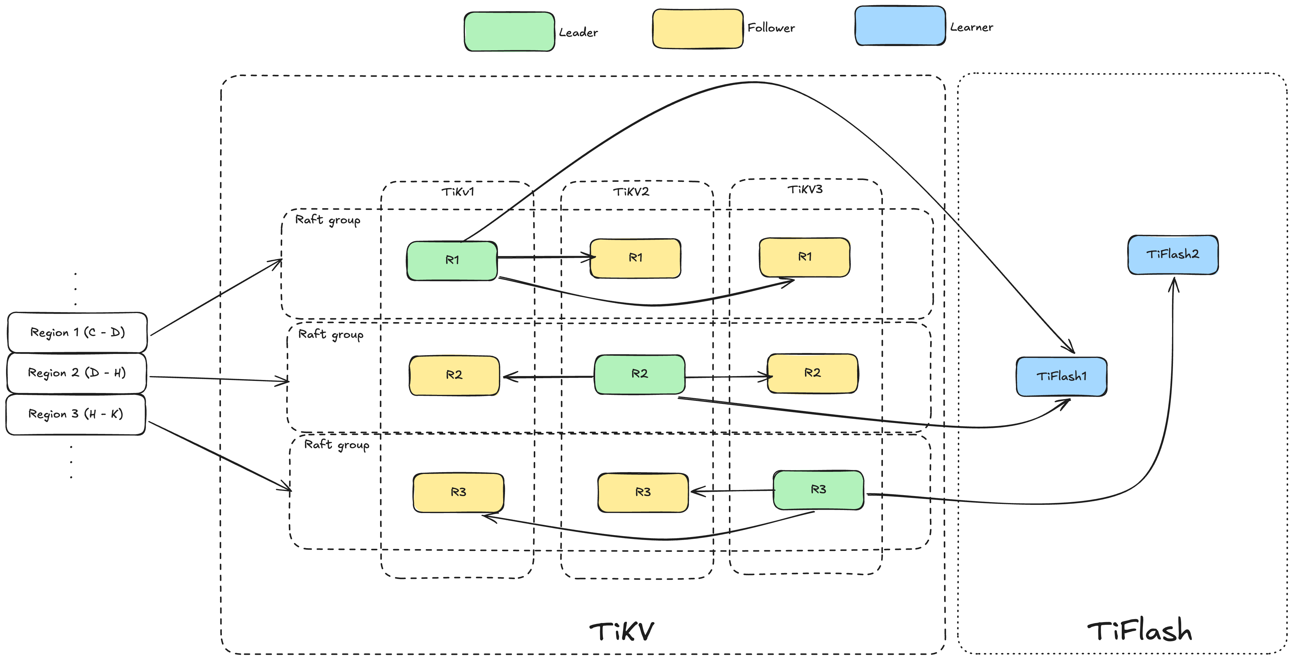 Each Region has multiple replicas for high availability. The Raft consensus algorithm is used to maintain consistency between replicas, forming a Raft group. The leader of each Raft group asynchronously replicate data from TiKV to TiFlash.