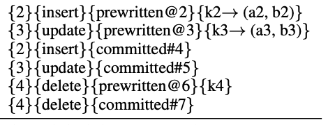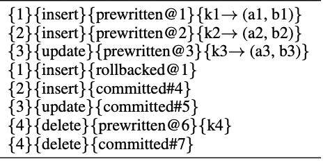 Compacting logs: Classify the logs into 3 statuses: prewritten, committed, rollbacked. Then doing compaction by delete invalid prewritten logs (the write which later has rollback logs). The raw logs: