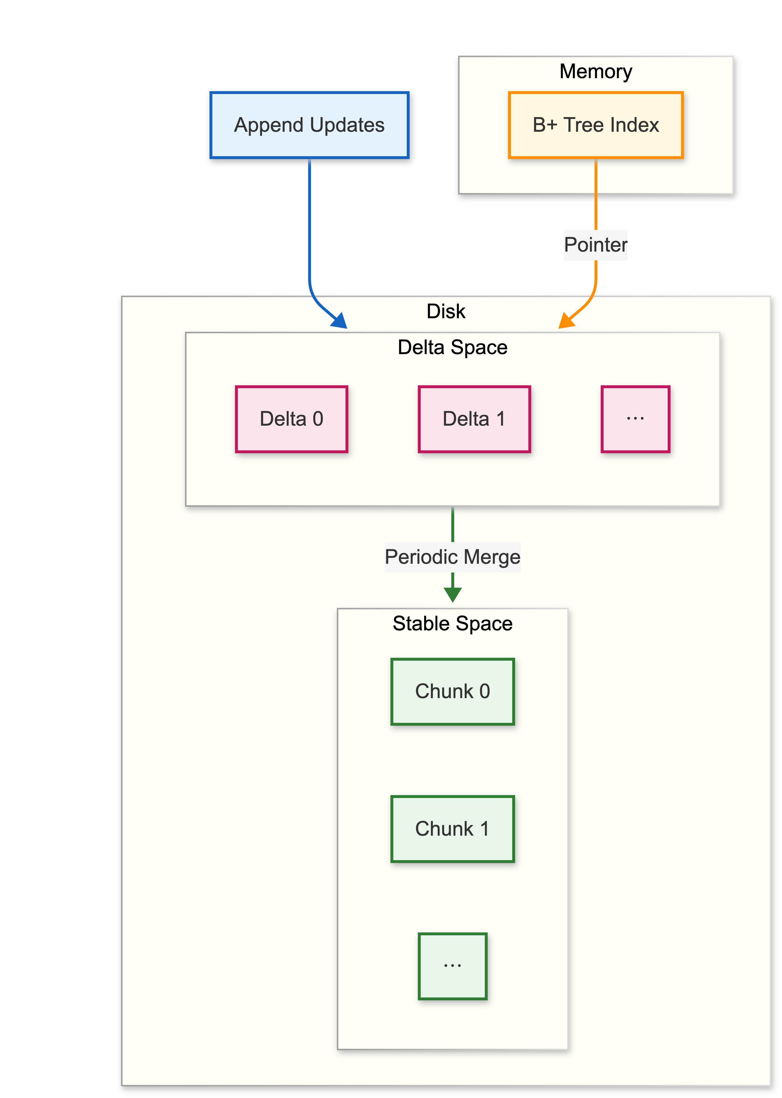 Incoming updates are first written to the delta space in append-only fashion, functioning like a write-ahead log (WAL). These deltas are periodically compacted into larger files and eventually merged into the stable space. During merging, inserted, updated, and deleted tuples are applied to stable chunks, which are atomically replaced.