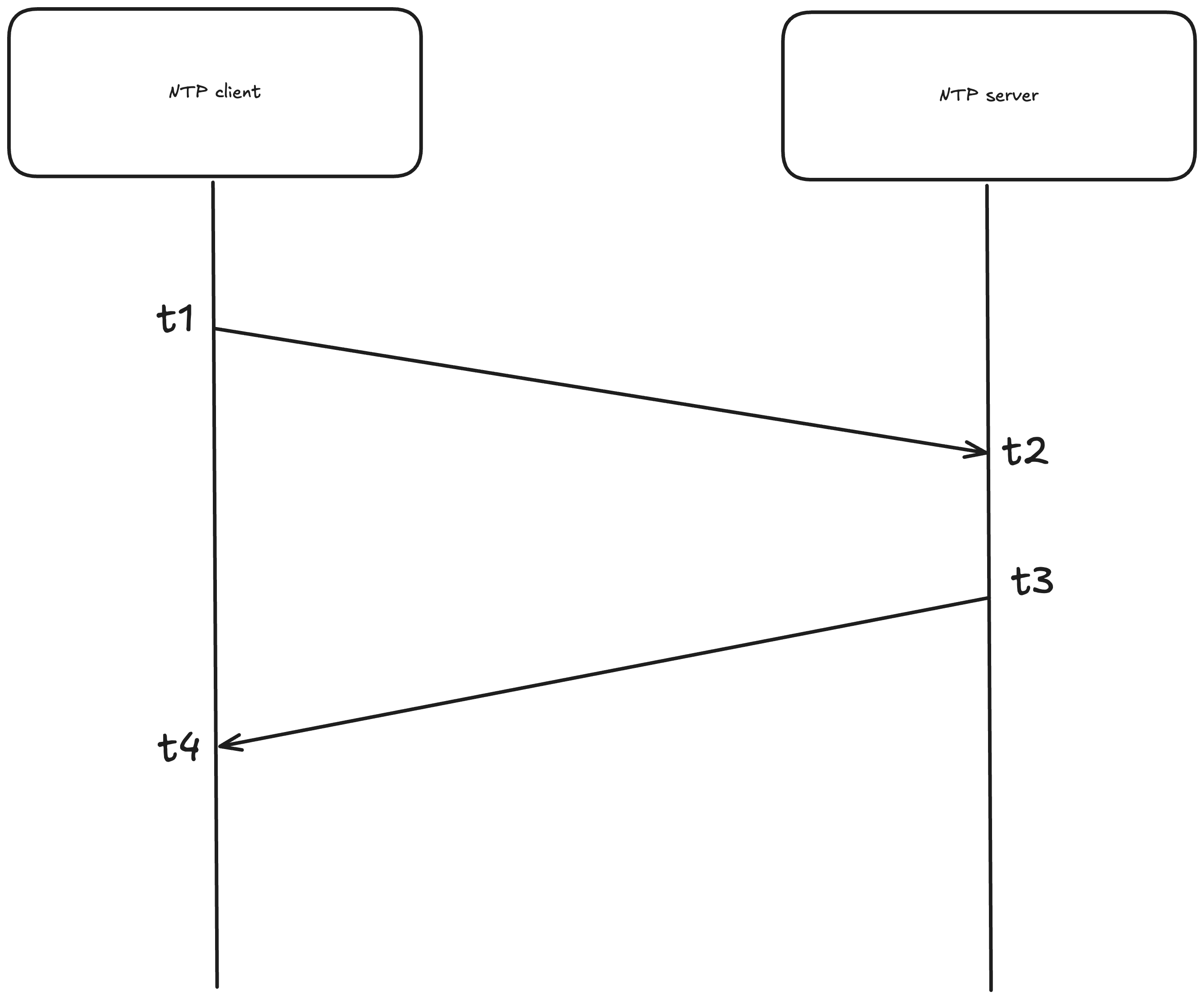 The NTP client sends the request at , the NTP server receives the request at and responds at . The NTP client receives the response at .
