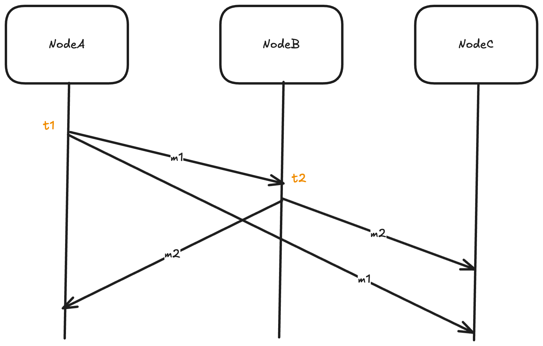 ⚠️ Note that: here means event causally precedes in the Lamport happens-before sense.