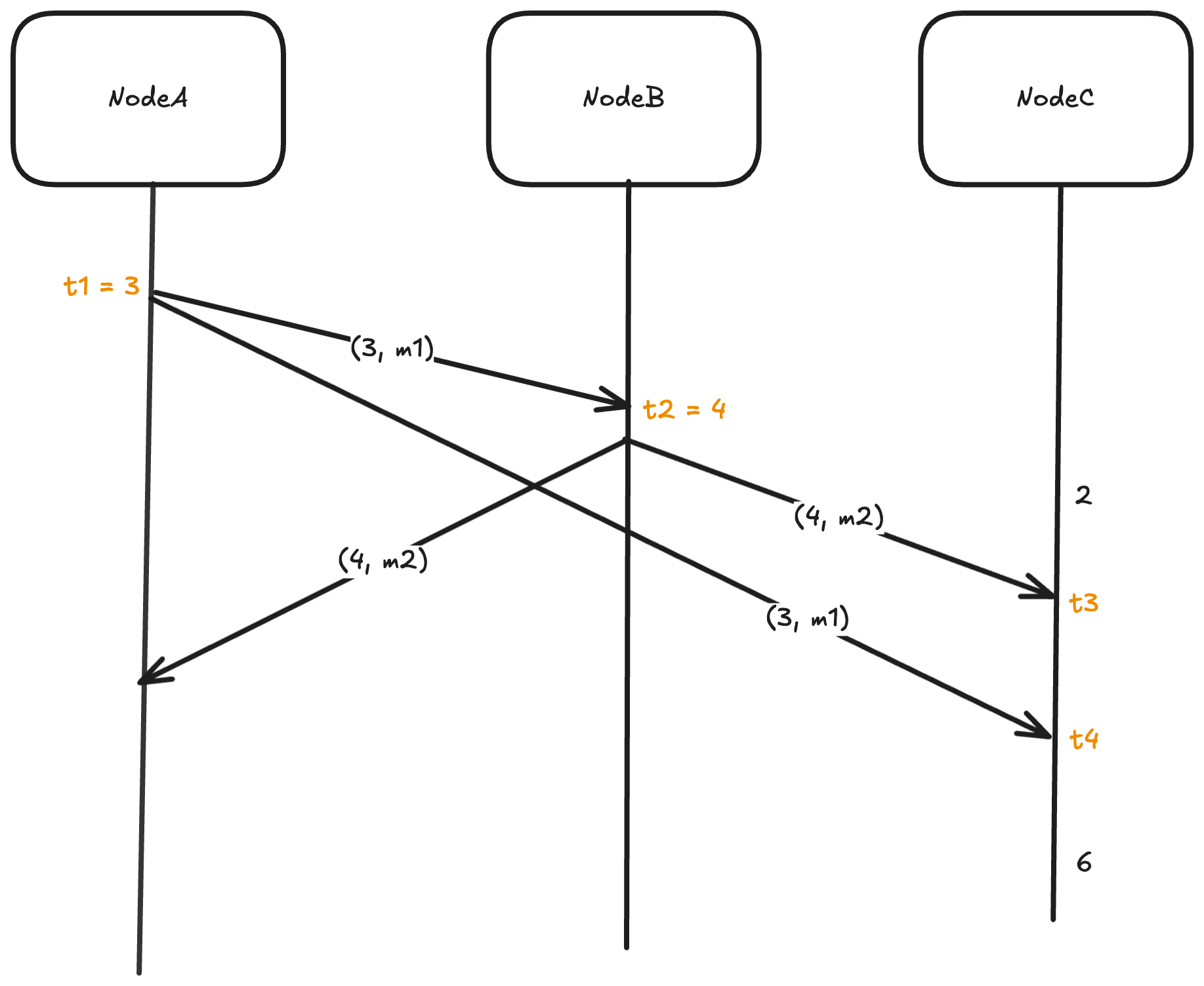 Each node maintains a logical counter , which is incremented whenever a local event occurs. This counter represents the node’s notion of logical time and advances monotonically as the system progresses.