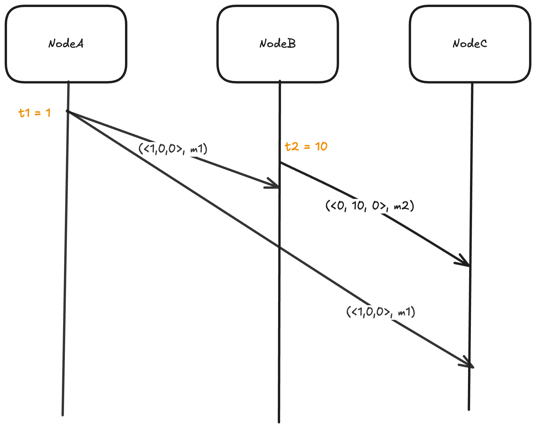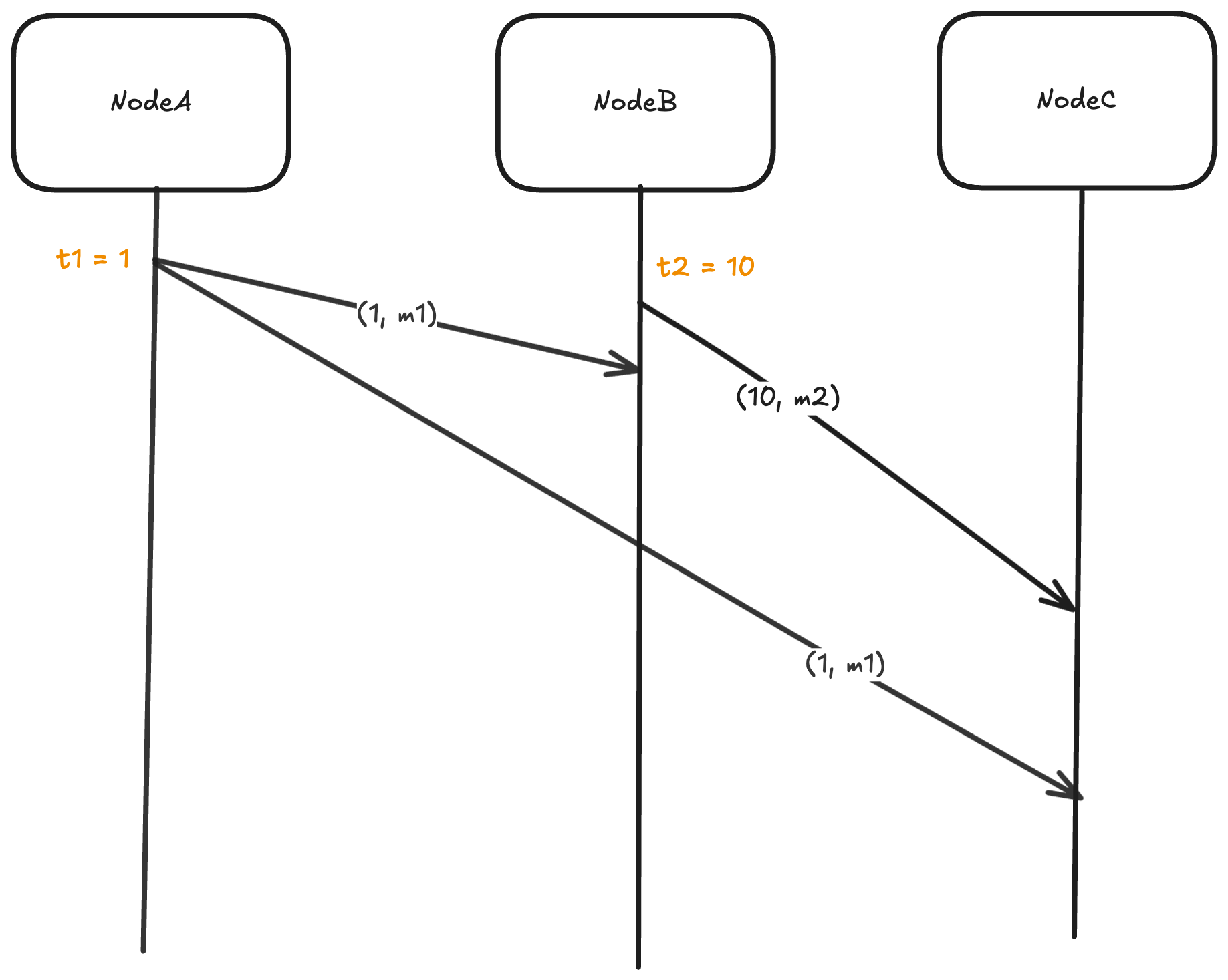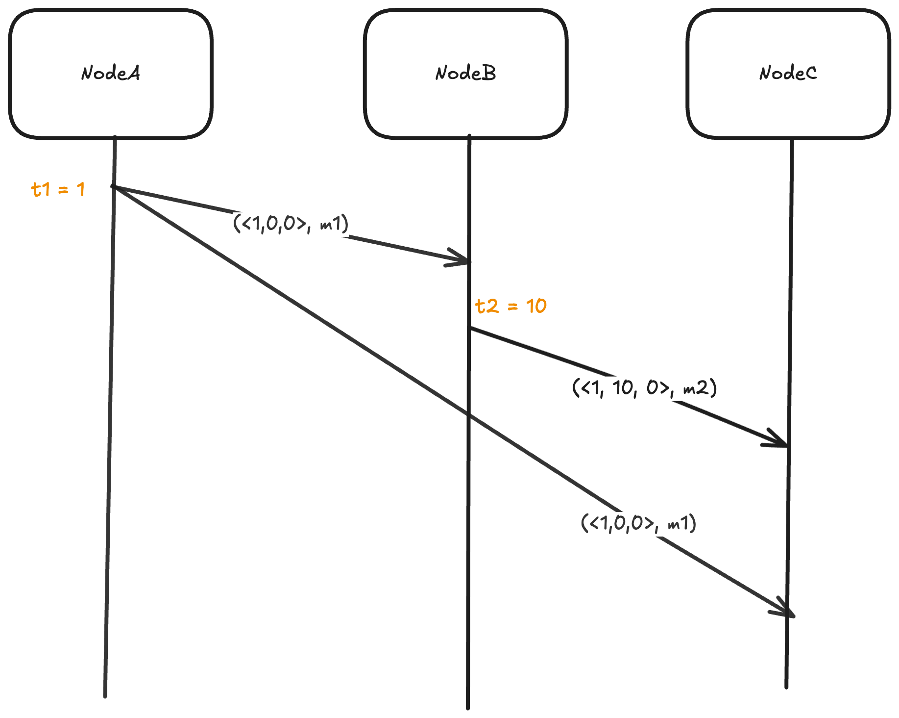 - Node A sends a message with Lamport timestamp 1 to node C.
