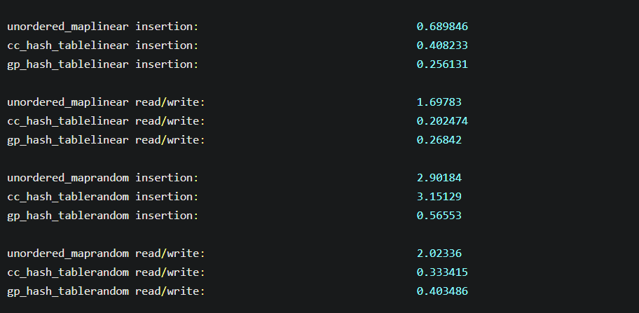 Another thing that you might wonder about is that in the benchmarks, there is another hash table cc_hash_table but I don't mention it because cc_hash_table and gp_hash_table use different hash functions. cc_hash_table uses chained hash tables while gp_hash_table use open addressed hash tables. You can check out this Link for more details. gp_hash_table sacrifices ~10% reading/writing speed to gain 3-6x in insertion/deletion/clearing
