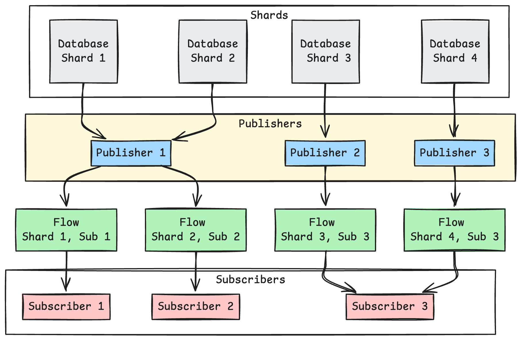 - Which means, if 2 different subscribers both want updates from Shard X, the publishers maintain 2 flows (one per subscriber for Shard X).